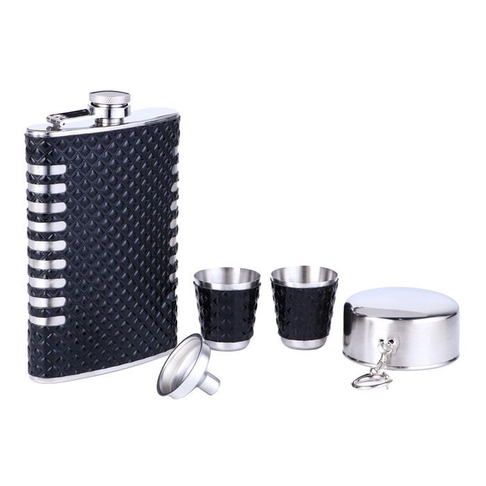 Интернет-магазин Сима-ленд готов предложить вам широкий ассортимент подарочных наборов из нержавеющей стали. Подарочный набор 5 в 1 «Ромбы»: фляжка 270 мл + воронка, 2 рюмки, стакан складной d=5 см - на все случаи жизни. Обратите внимание, оригинальное оформление фляжки и удобная классическая, слегка изогнутая, форма выделяет её среди других. Не упустите свой шанс стать обладателем этого стильного набора с полезным составом на все случаи жизни.