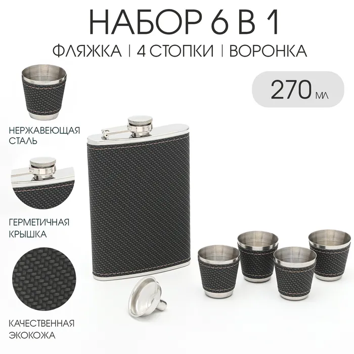 Подарочный набор 6 в 1: фляжка 270 мл, 4 стопки по 40 мл, воронка — Характеристики
