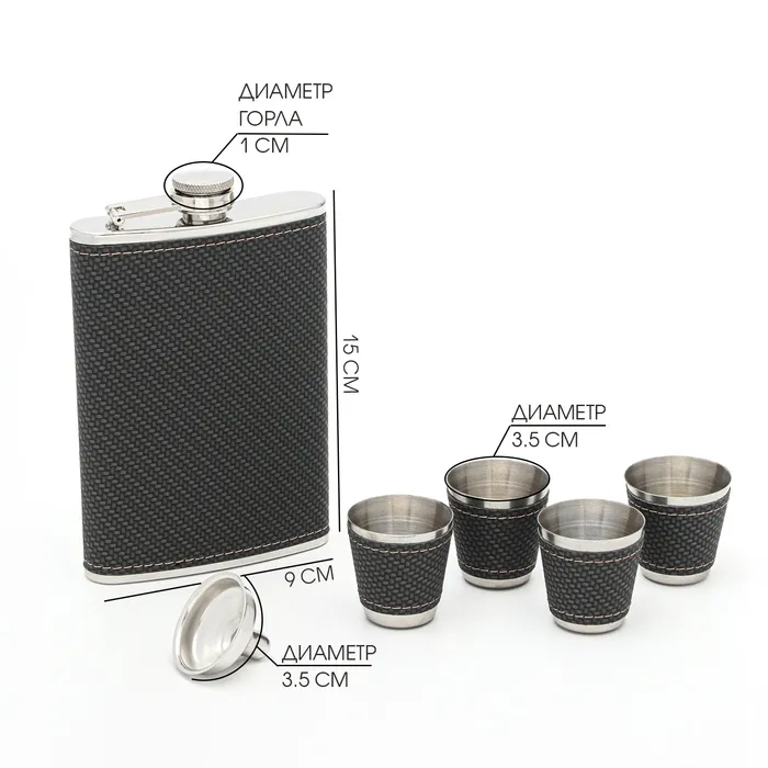 Фляжка 270 мл: изготовлена из нержавеющей стали, сохранит ваши любимые напитки холодными в течение длительного времени.4 стопки по 40 мл: компактные и прочные, подходят для любых напитков.Воронка: для удобного наполнения фляжкиИдеальное решение для путешествий, пикников, рыбалки и любых других активностей на природе. Этот подарочный набор станет отличным подарком для любителей приключений и активного отдыха.