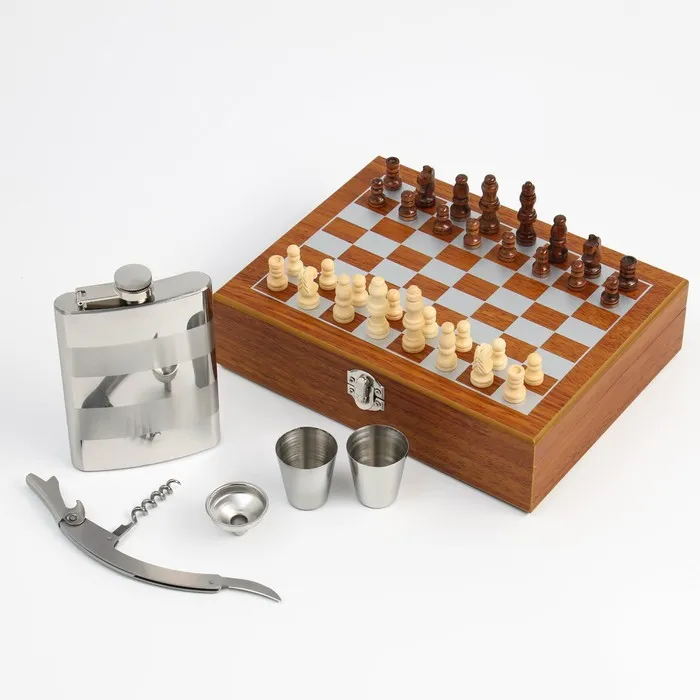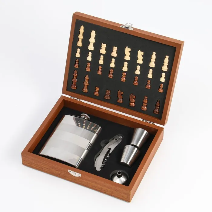 Подарочный набор 6 в 1: фляжка 8 oz, воронка, штопор, 2 стопки для водки, шахматы деревянные — Характеристики
