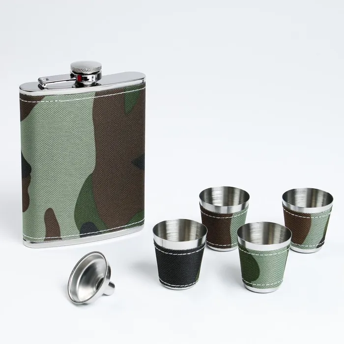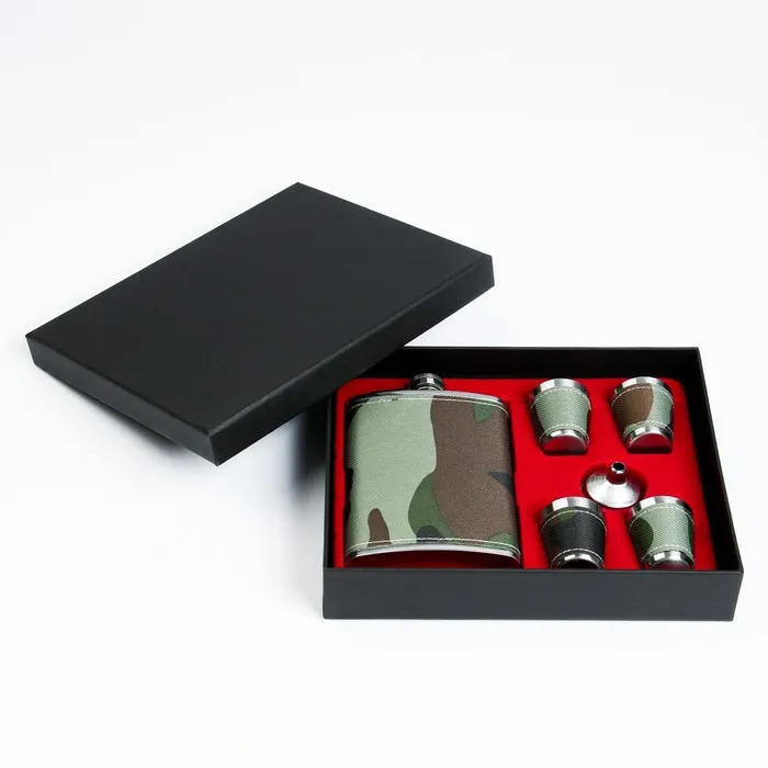 Отличным дополнением в наборе с фляжкой являются 4 рюмки и воронка для удобного переливания жидкостей, упакованы в подарочную коробку. Подарочный набор подойдёт в качестве подарка папе, брату, другу, брату, дедушке на 23 февраля, день рождения или любой другой праздник.