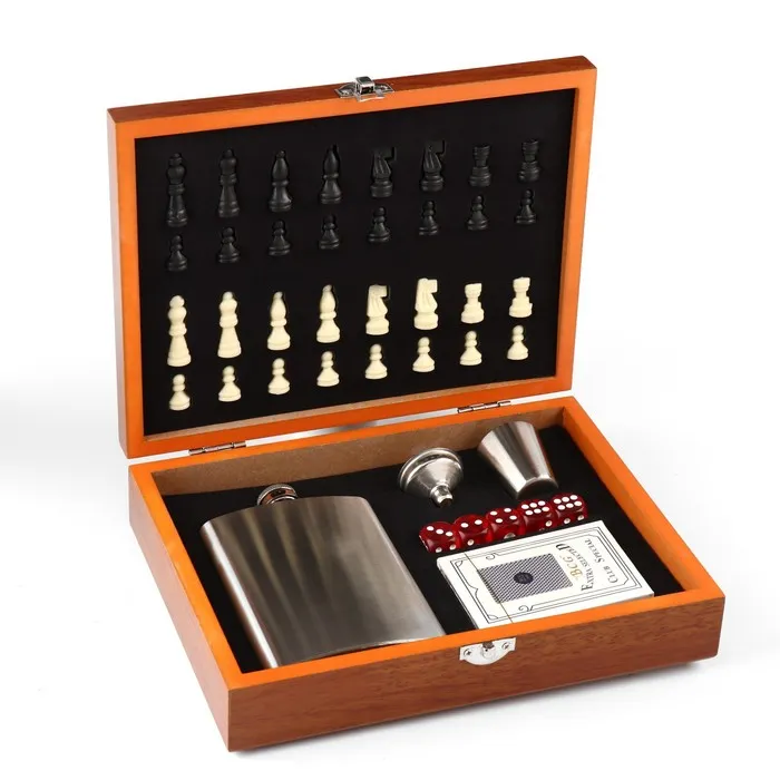 Подарочный набор 6 в 1: шахматы, карты, кубики, рюмка, воронка, фляжка — Характеристики