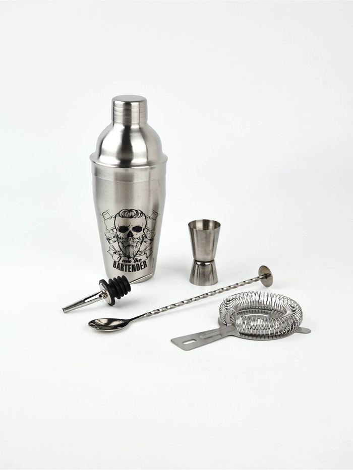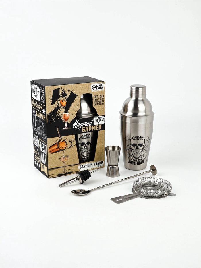 Барный набор включает в себя обязательный инвентарь для приготовления коктейлей: