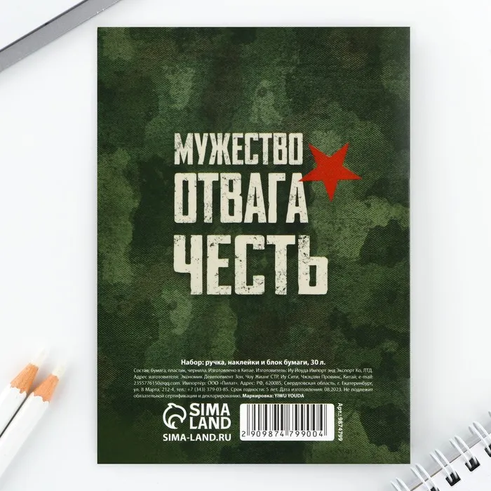 Подарочный набор, блок бумаги 30 л, ручка синяя паста 1.0 мм, наклейки 5 шт. «23 февраля» — Характеристики
