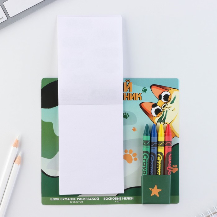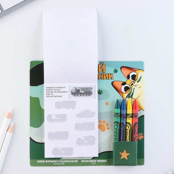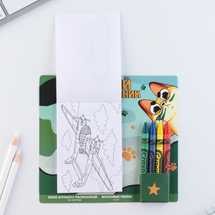 Подарочный набор блок листов с раскраской и восковые мелки «Герой и защитник»