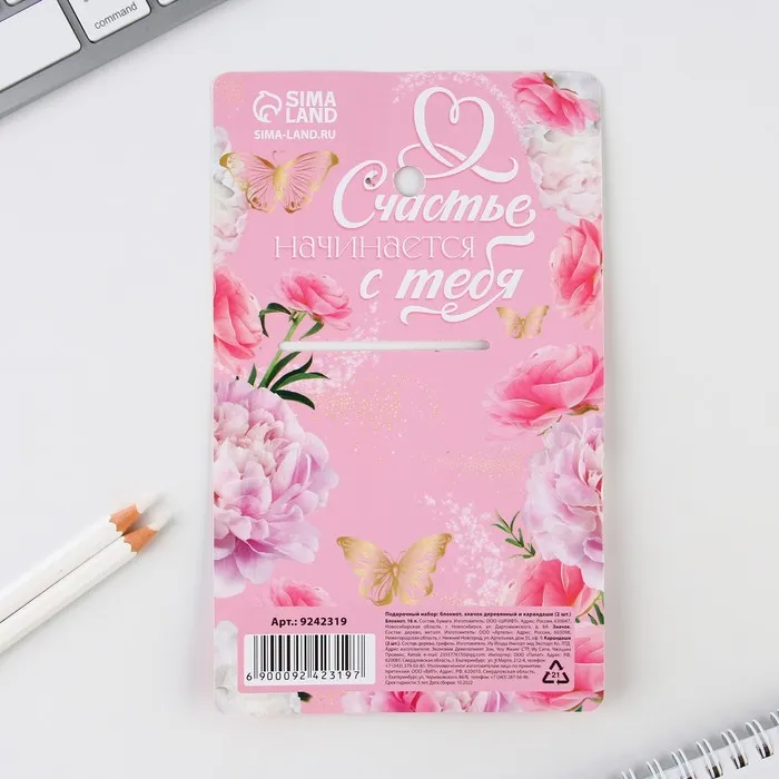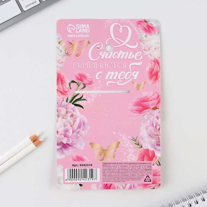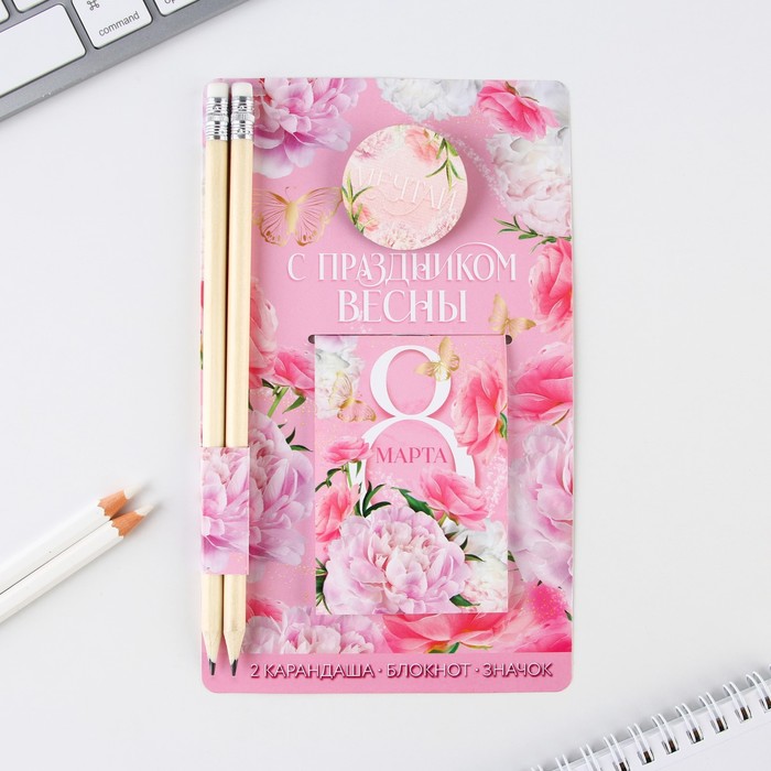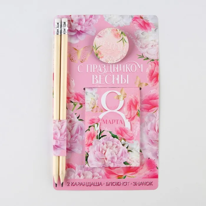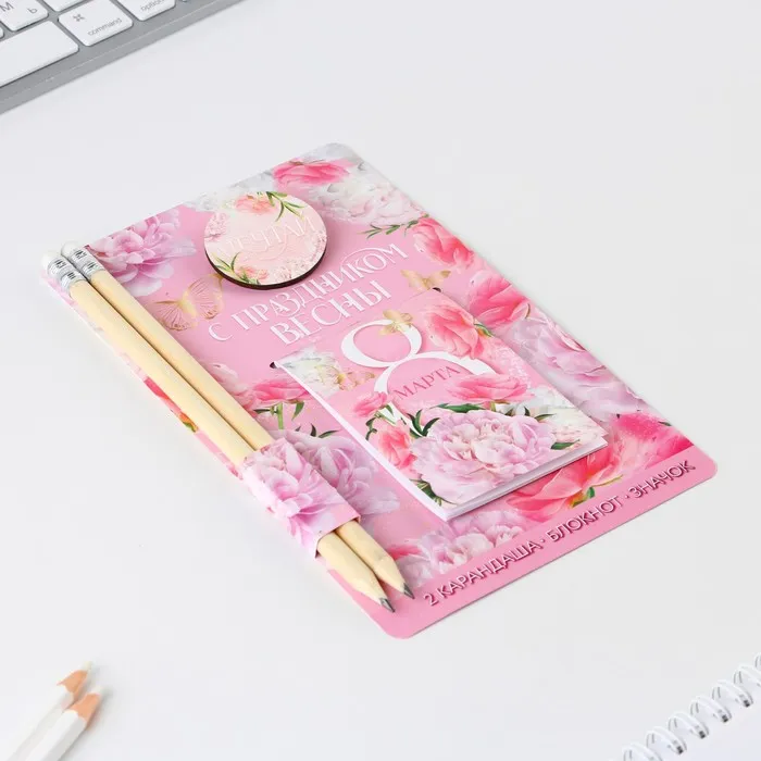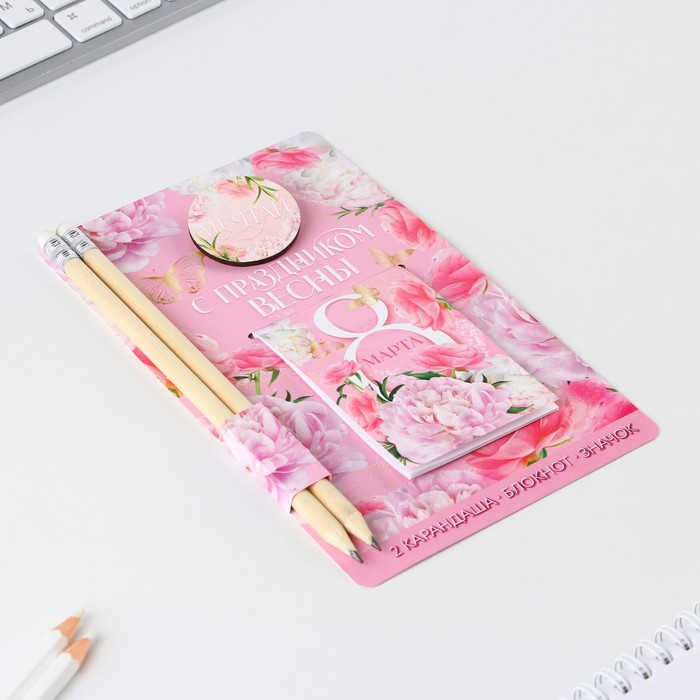 Подарочный набор: блокнот, карандаши (2 шт, ч/г) и значок-дерево «С праздником весны. 8 марта» — Характеристики