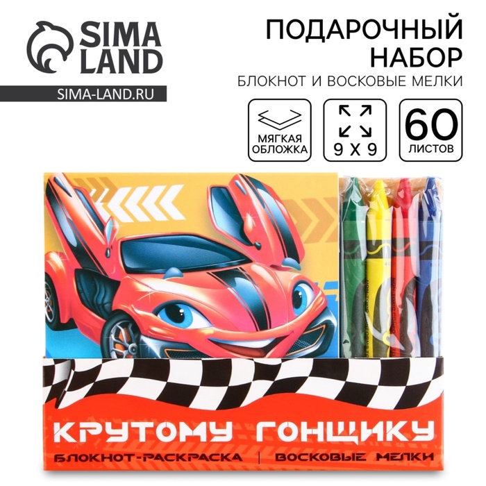 Подарочный набор: блокнот-раскраска и восковые мелки «Крутому гонщику» — Характеристики
