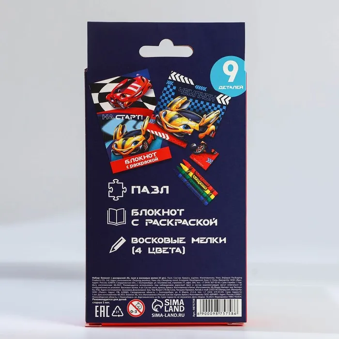 Подарочный набор, блокнот - раскраска, мелки 4 шт. «Гонщику» — Характеристики