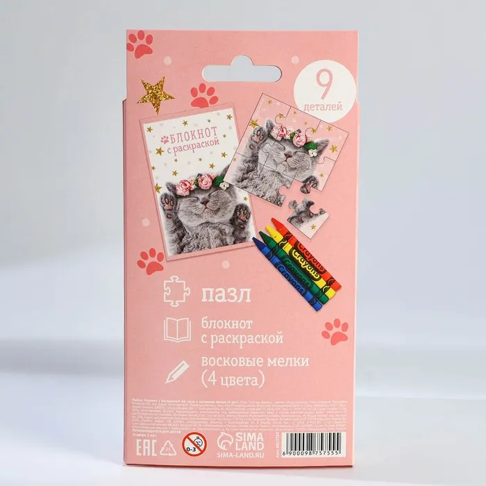 Подарочный набор, блокнот - раскраска, мелки 4 шт. «Кошка» — Характеристики