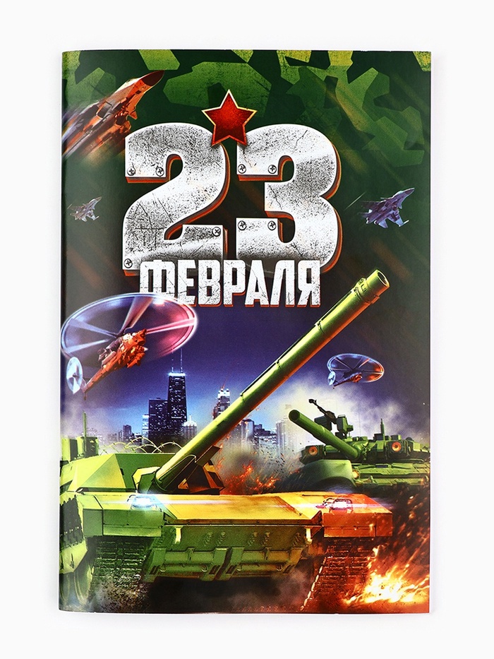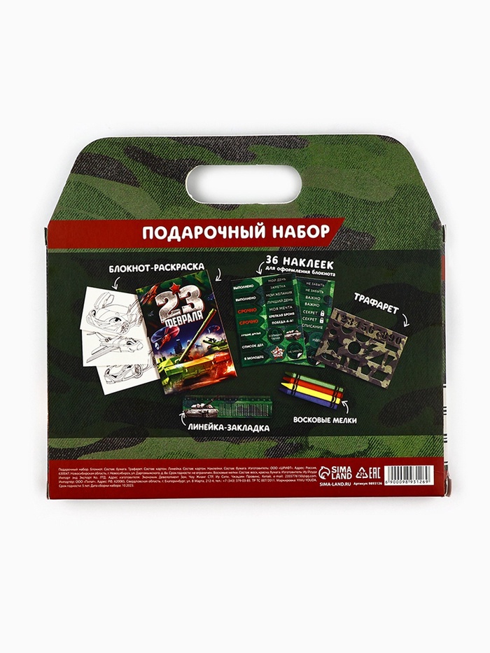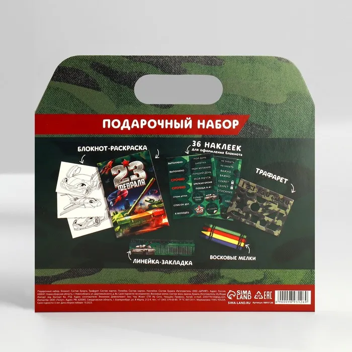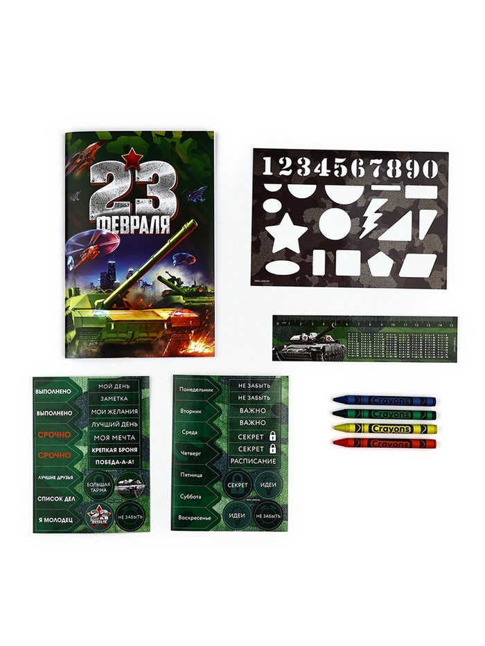 Подарочный набор блокнот-раскраска, трафарет, наклейки и восковые мелки «23 февраля» — Характеристики