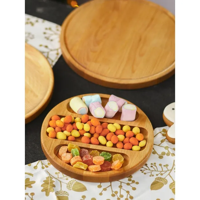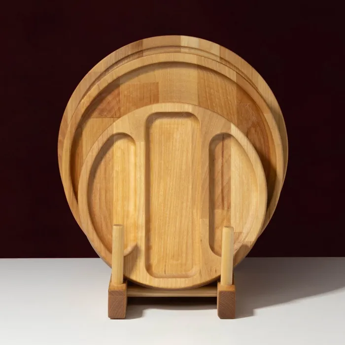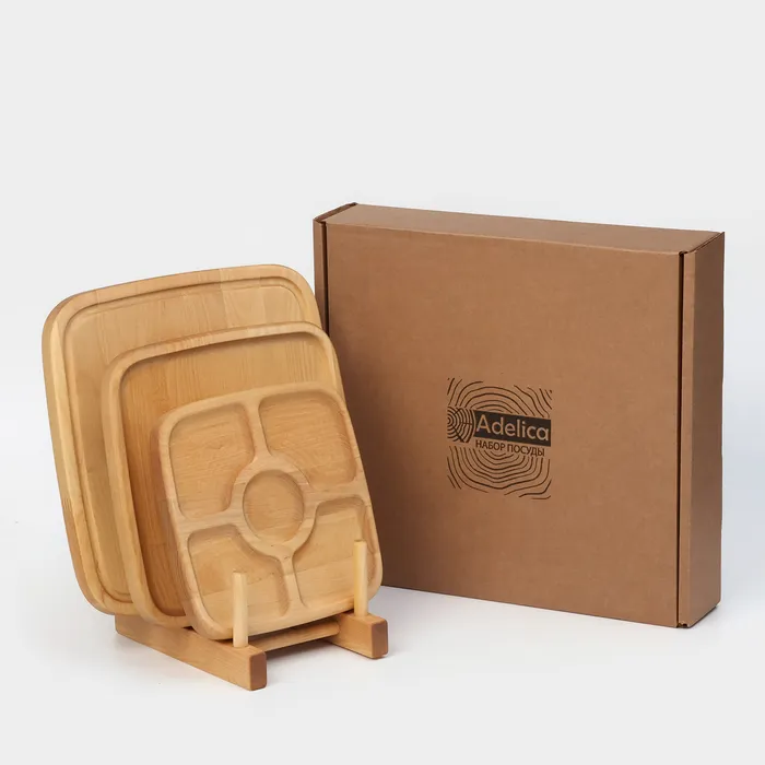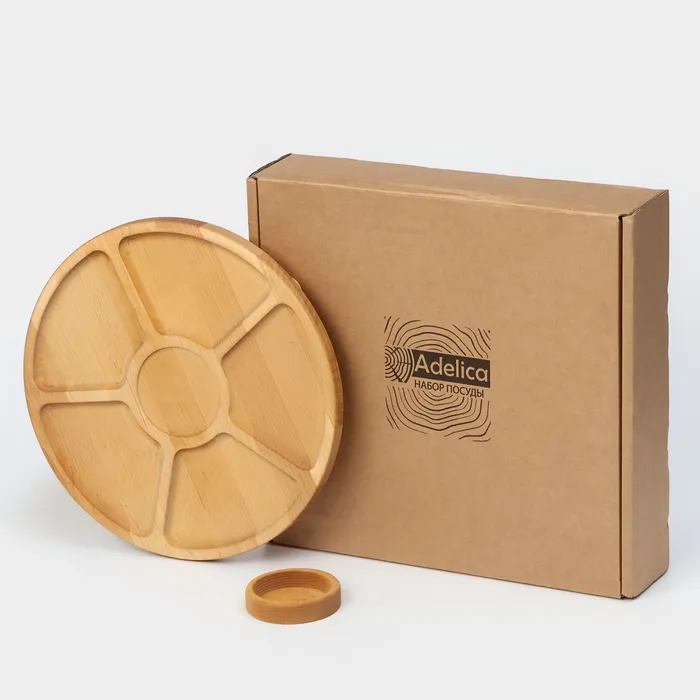 Подарочный набор деревянной посуды Adelica «Бари», доска разделочная d=25 см, блюдо для подачи d=24 см, менажница 3 секции d=20 см, подставка, берёза — Характеристики