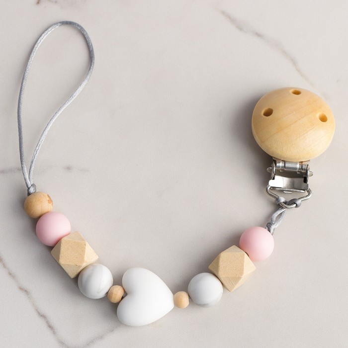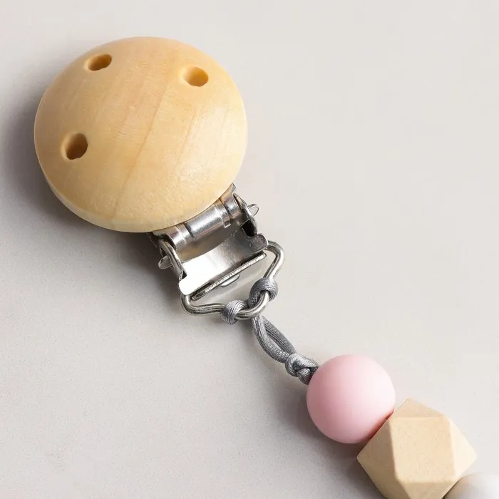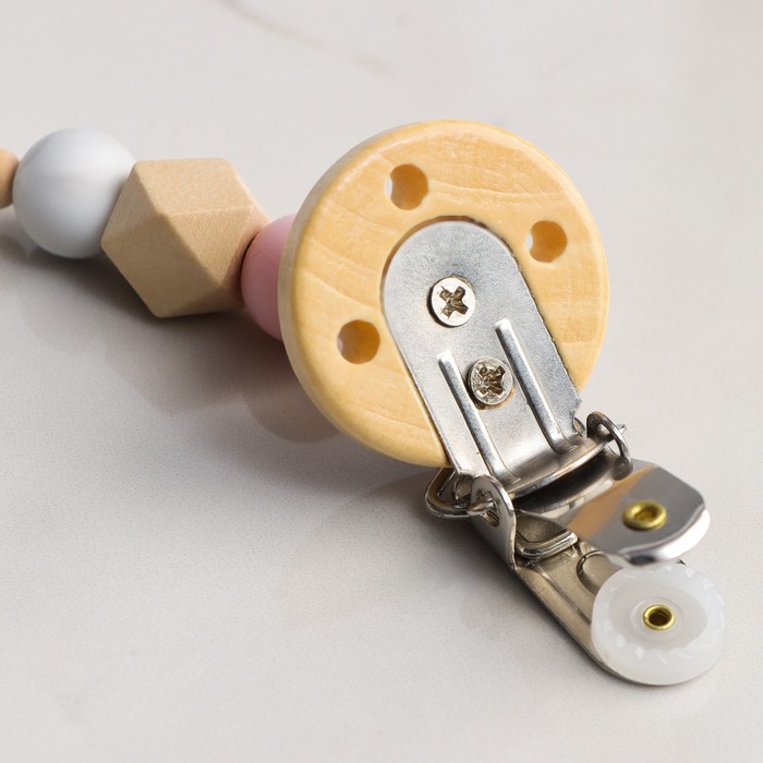 Изделие фиксируется на одежде ребёнка. На конце цепочки есть карабин, который зацепляется за кольцо пустышки. Надёжное крепление убережёт вещь от падения на пол, если малютка случайно выронит её изо рта.