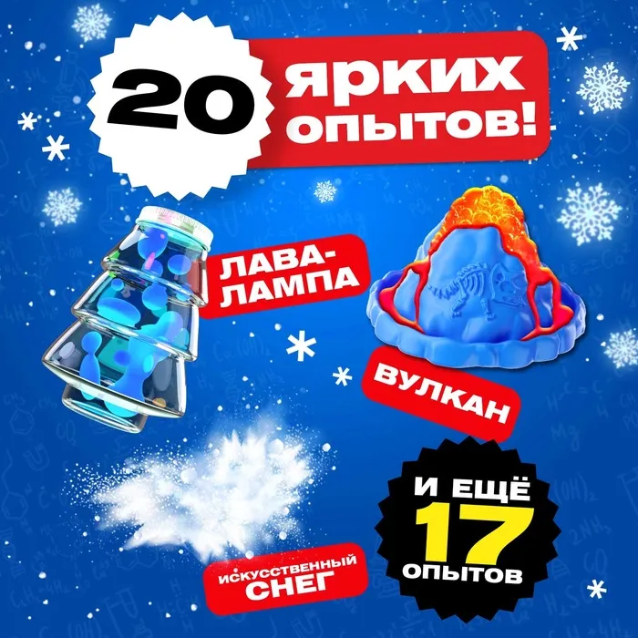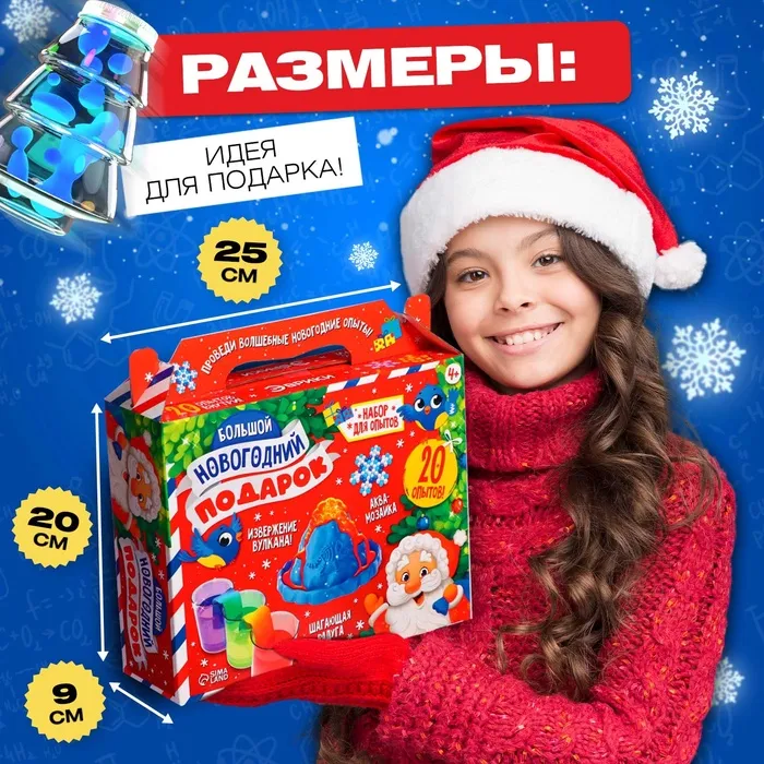 С набором для опытов «Большой новогодний подарок» — то, что нужно для полезного и интересного досуга! Такой подарок поможет ребёнку скрасить ожидание Нового года, а также позволит провести целых 20 увлекательных опытов!