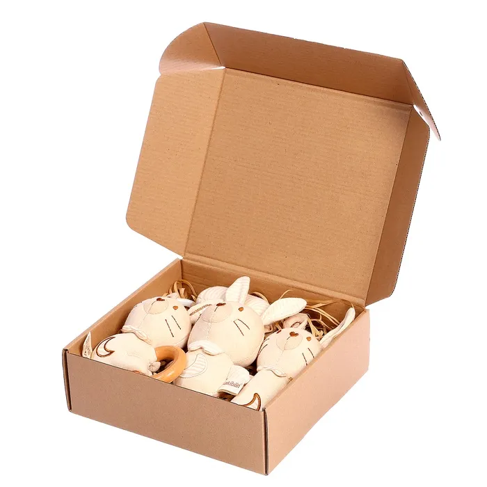- Игрушки изготовлены из текстиля и дерева — экологичных и гипоаллергенных материалов.