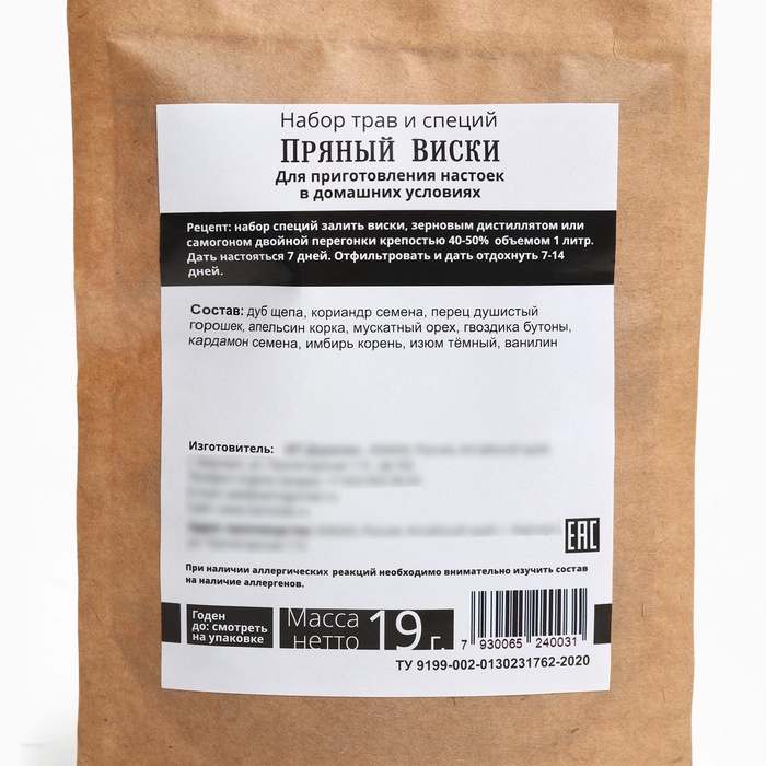 Подарочный набор для приготовления алкоголя «Пряный виски»: травы и специи 19 г, штоф 500 мл., инструкция