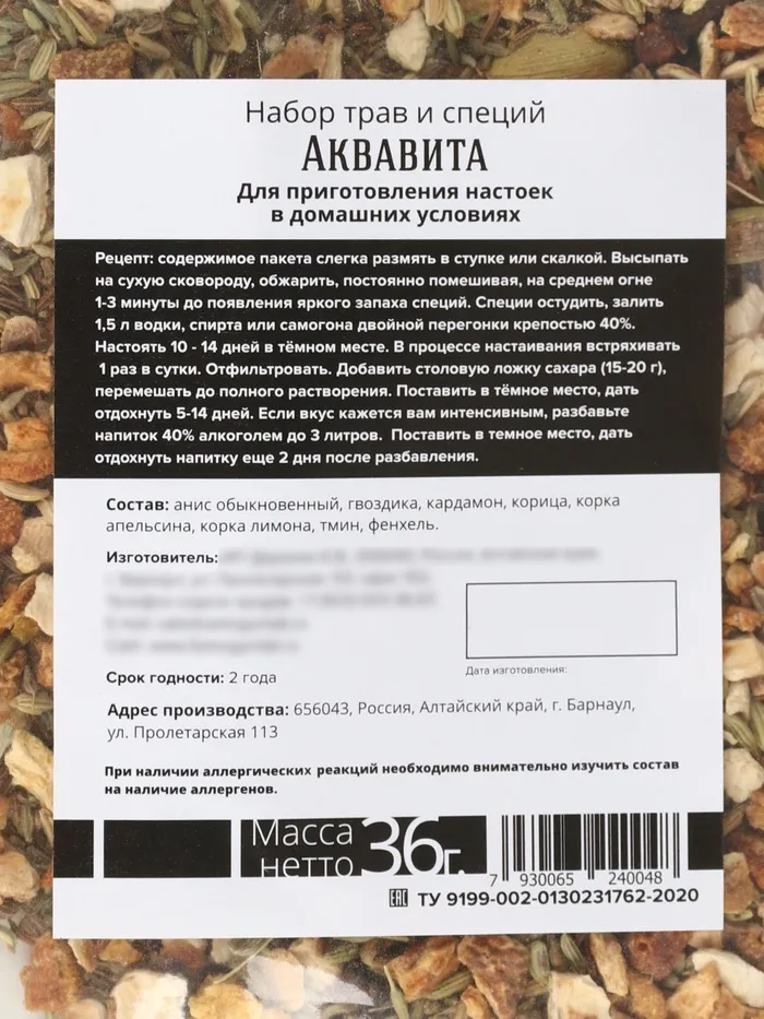 Состав: анис, гвоздика, кардамон, корица, цедра лимона, тмин, фенхель.