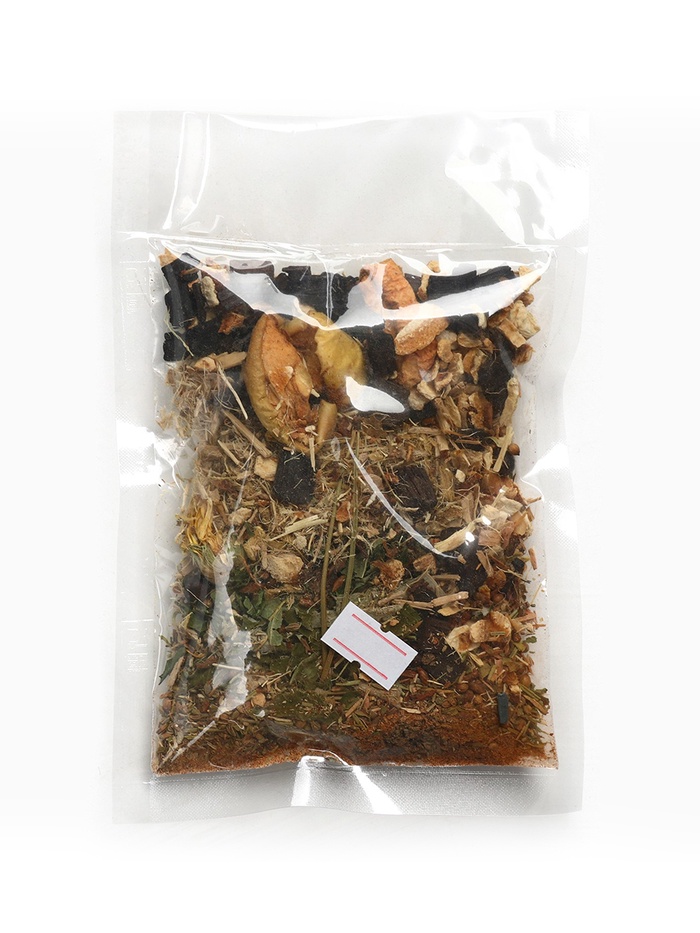 Состав: яблоко сухое, дуб чипсы, апельсин корка, лимон корка, элеутерококк корень, алтей корень, березовые почки, солодка корень, календула, можжевельник лист, смородины кора, дуба, розмарин, дягиль корень, имбирь корень, малина лист, корица, мята, анис, кориандр, бадьян, чабрец, шалфей, сосна хвоя, эвкалипт.
