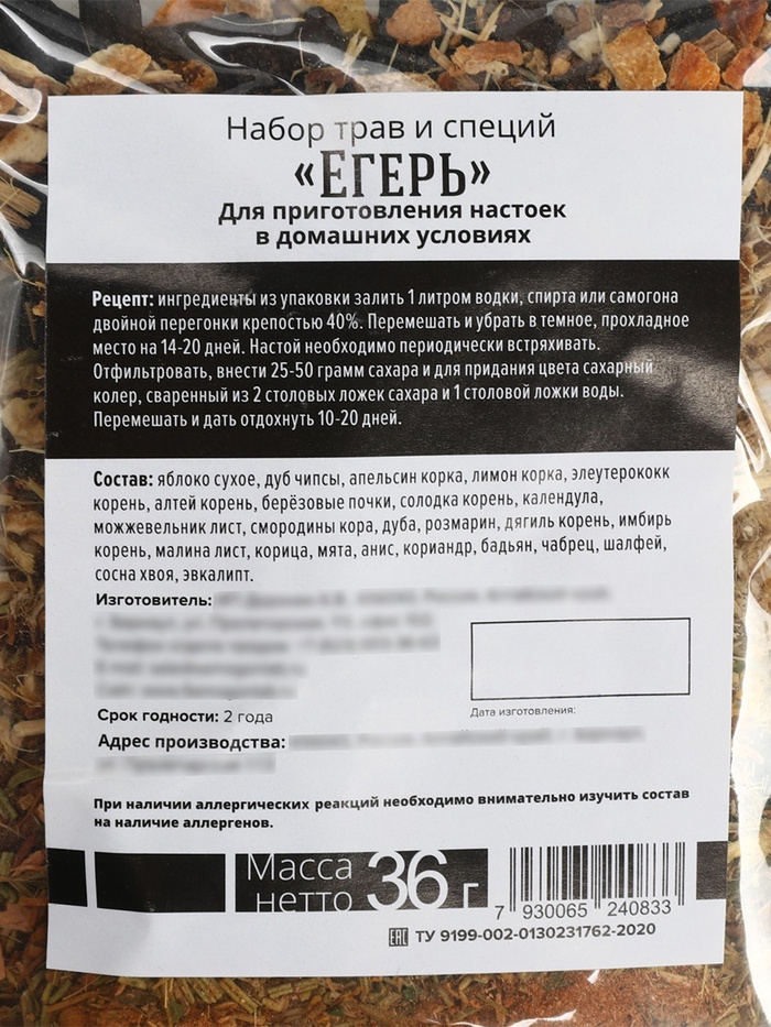 Подарочный набор для приготовления настойки «Егерь»: травы и специи 36 г, штоф 500 мл., инструкция — Характеристики