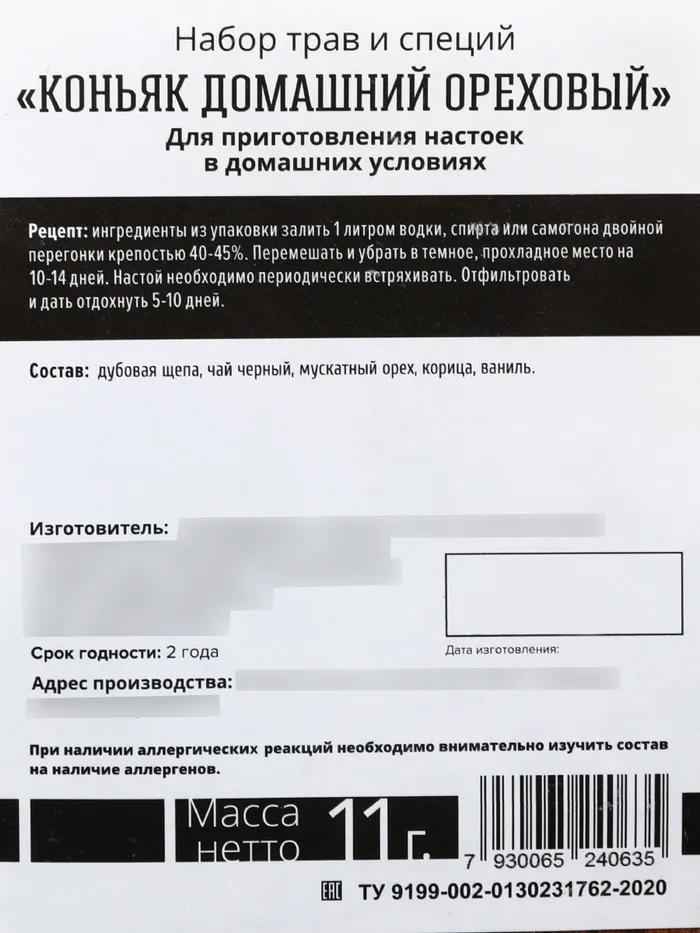 Подарочный набор для приготовления настойки «Коньяк ореховый»: набор трав и специй 11 г., штоф 500 мл., инструкция — Характеристики