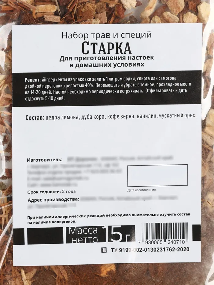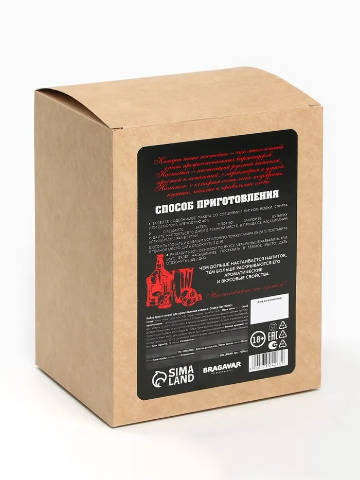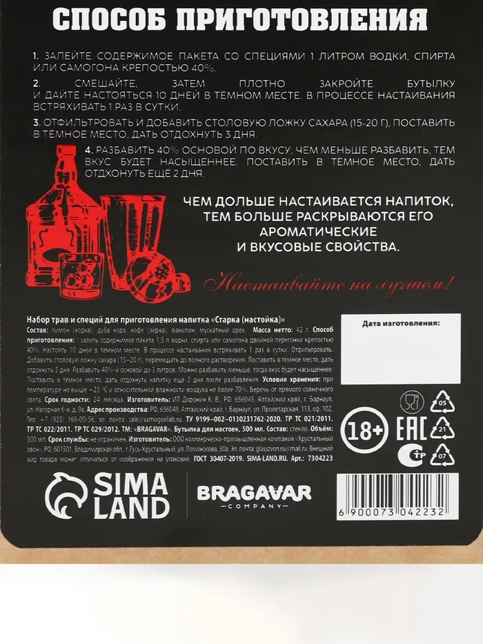 Подарочный набор для приготовления настойки «Ликёр Старка»: набор трав и специй 20 г., штоф 500 мл., инструкция — Характеристики