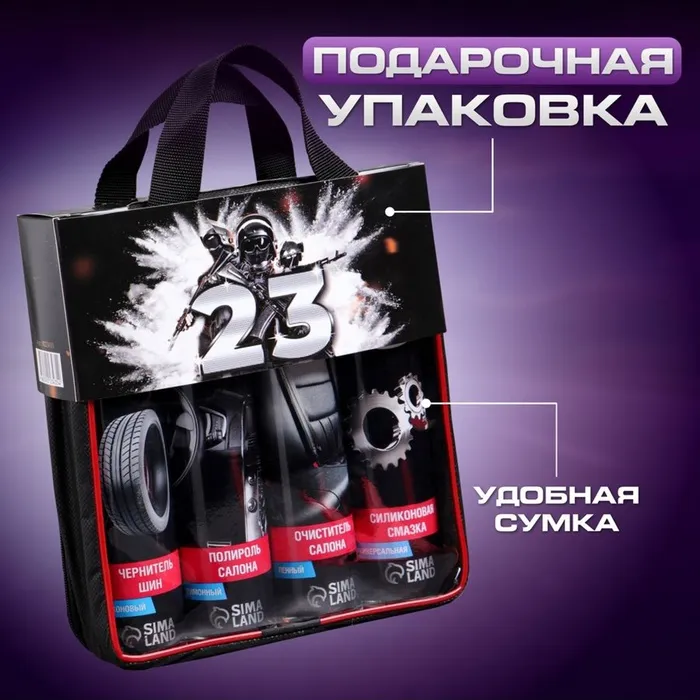 Подарочный набор для ухода за авто "23 Февраля" Military, набор автохимии: силиконовая смазка 400 мл, полироль пластика 400 мл, очиститель салона 400 мл, чернитель шин 400 мл, тряпка из микрофибры — Характеристики