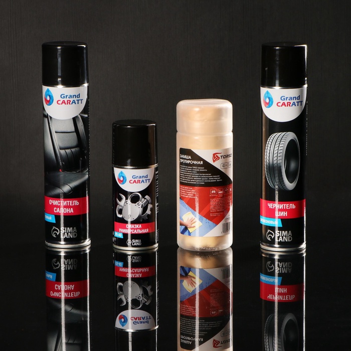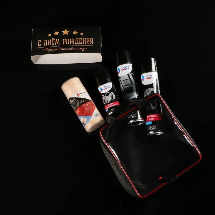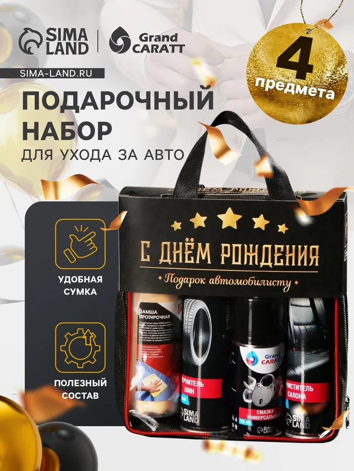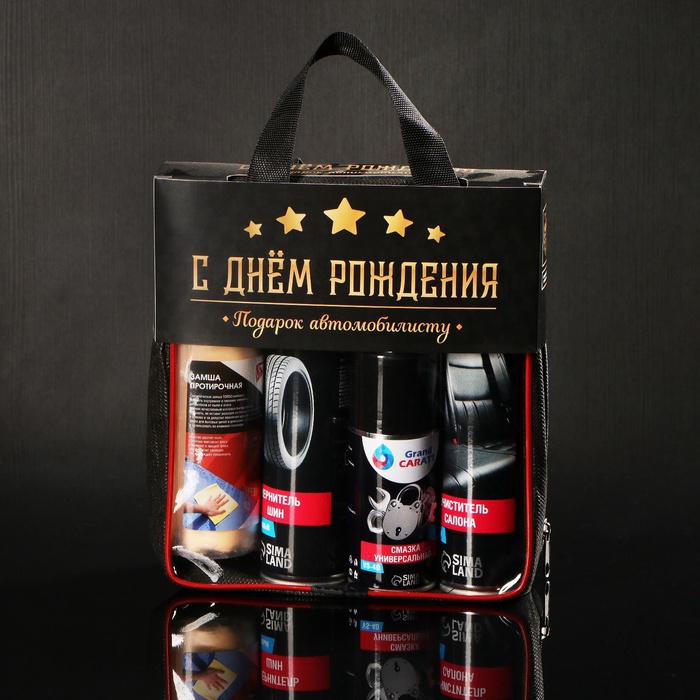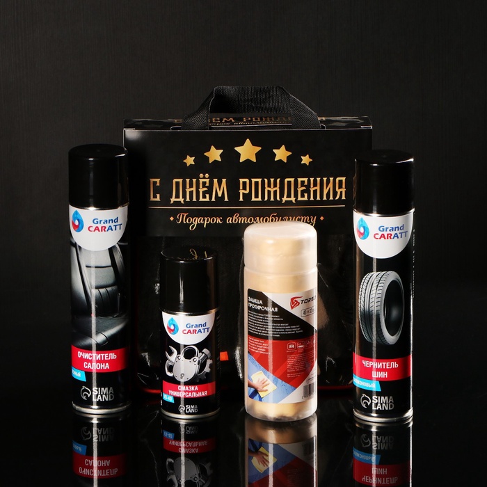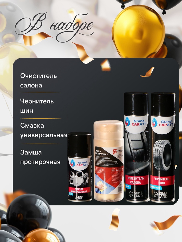 Подарочный набор для ухода за авто "С днём рождения": очиститель салона 400 мл, чернитель шин 400 мл, смазка универсальная 210 мл, замша протирочная — Характеристики