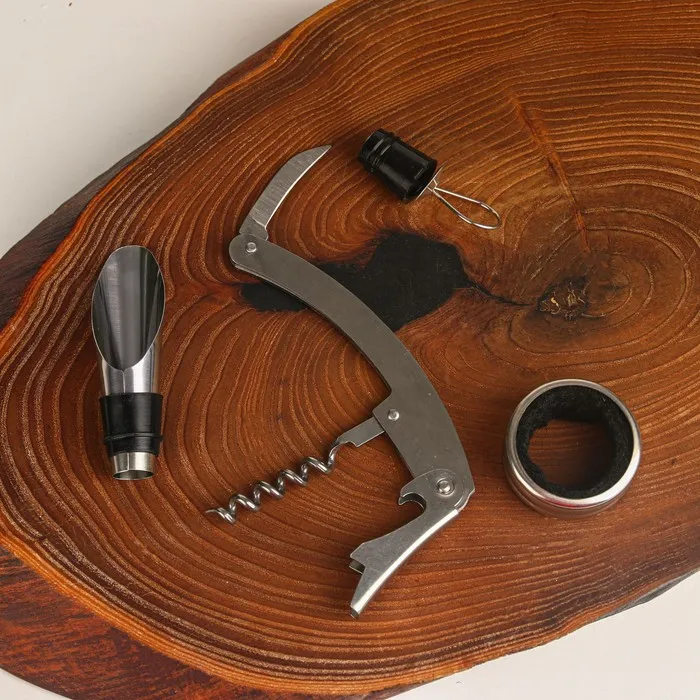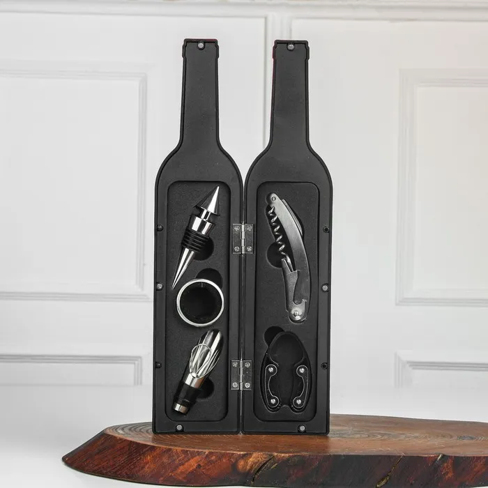 Набор станет отличным презентом для истинных ценителей вина. Идеальное сочетание необходимых приспособлений и необычный дизайн, отлично подойдет в качестве подарка к особенным торжествам или по другому поводу.