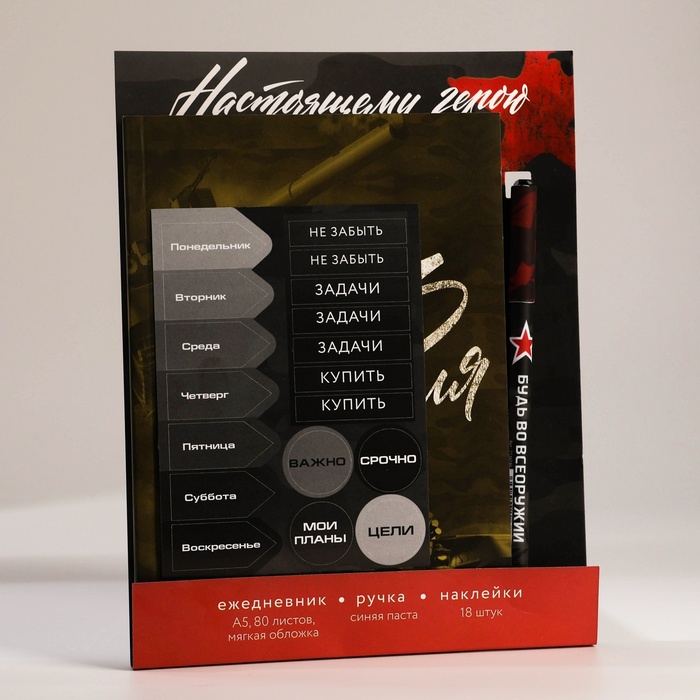 Подарочный набор, ежедневник А5, 80 листов, наклейки и ручка «С 23 февраля» — Характеристики