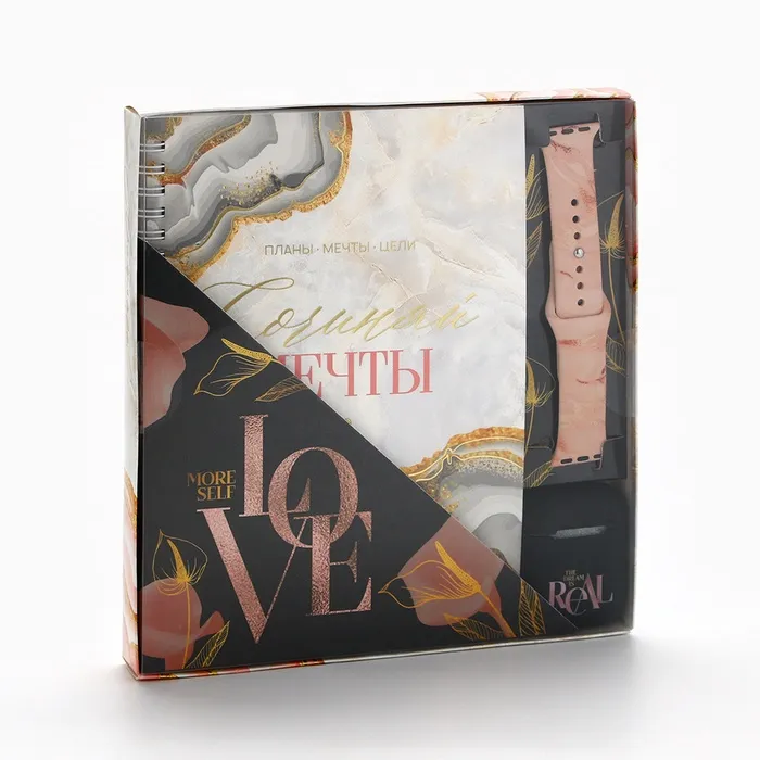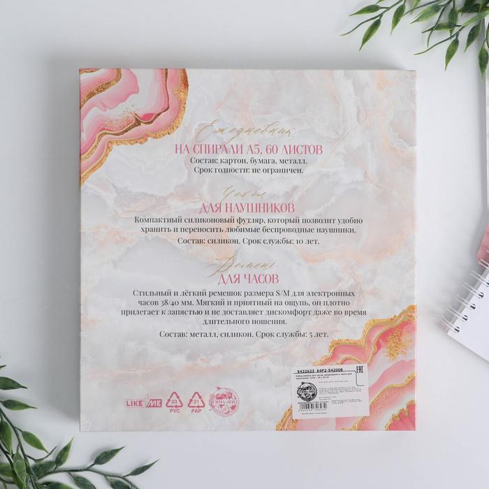 Подарочный набор с ежедневником, ремнём для часов и чехлом для наушников пойдет деловым людям, которые желают всегда оставаться на связи и держать всё под контролем.