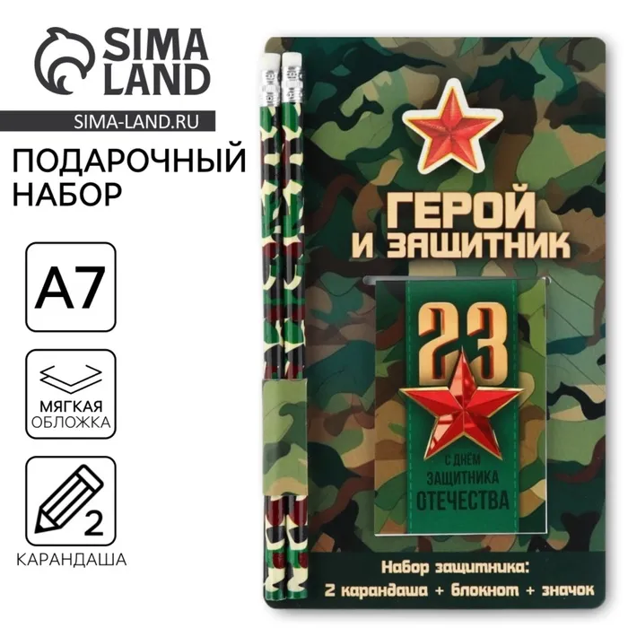 Подарочный набор «Герой и защитник. 23 февраля», блокнот, карандаши (2 шт) и значок — Характеристики