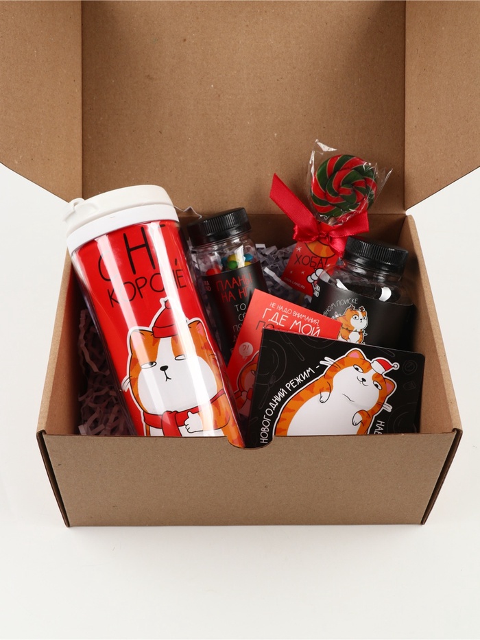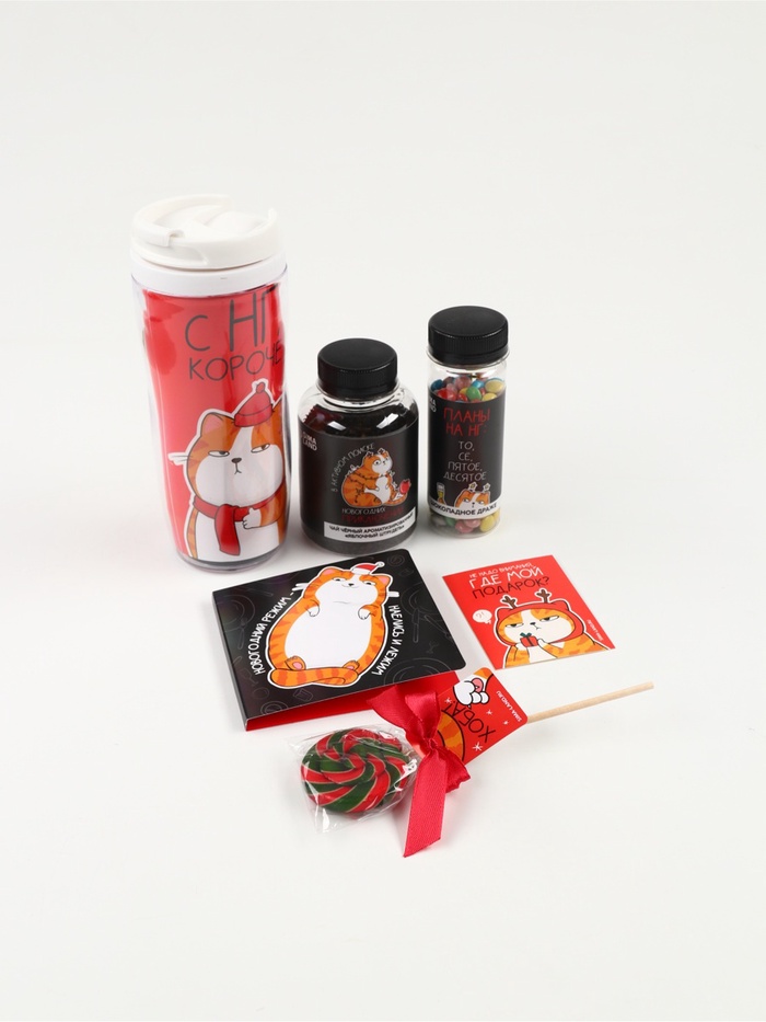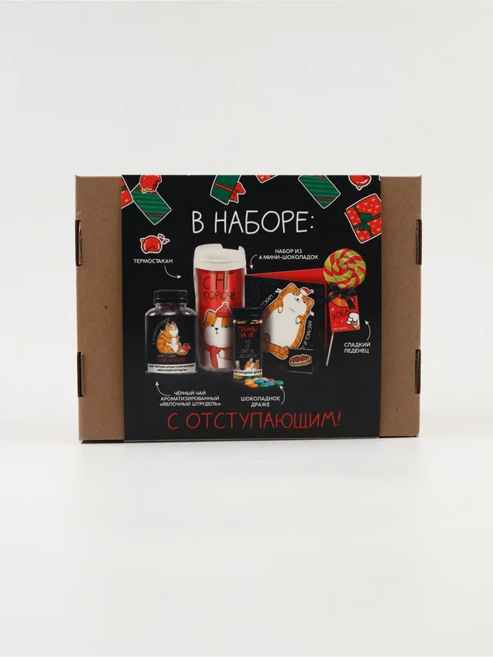 Подарочный набор гифтбокс «Поменьше косяков, побольше ништяков», чай, драже, шоколад, термостакан, леденец — Характеристики