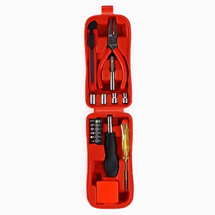 Возникли неполадки в пути? Нужно что-то починить дома? В этом поможет специальный комплект инструментов. В нём есть всё необходимое для современного мужчины: рулетка, плоскогубцы, индикатор напряжения, удлинитель для бит, торцевые головки, отвёртка со сменными насадками, резак, биты.