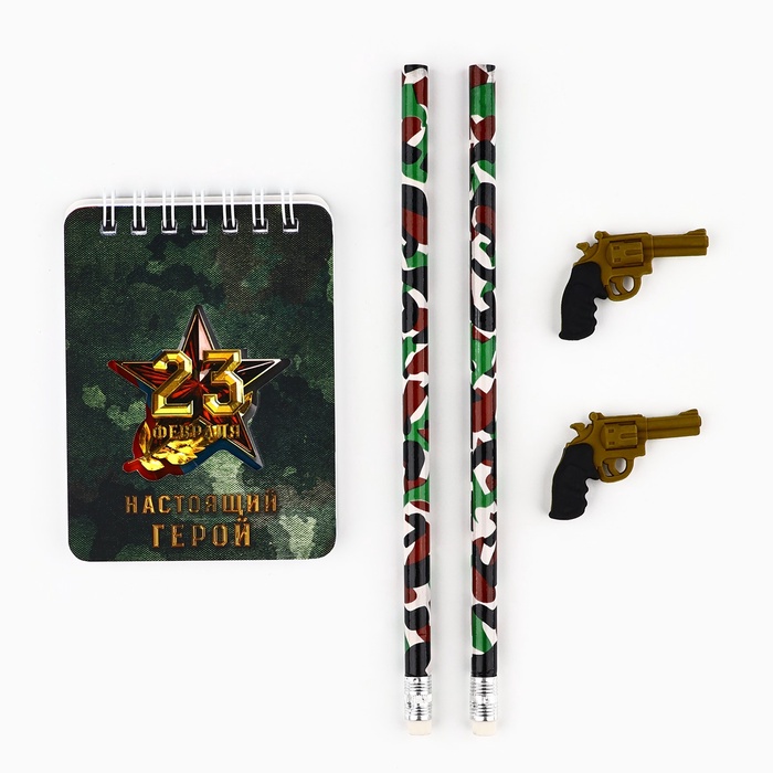 Подарочный набор канцелярский, ластики 2 шт., блокнот, карандаши «День настоящих героев. 23 февраля«» — Характеристики