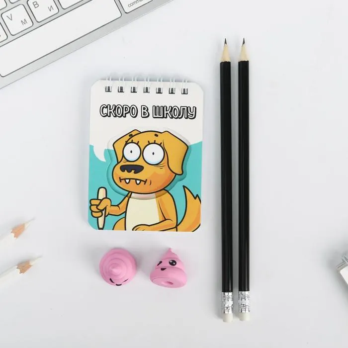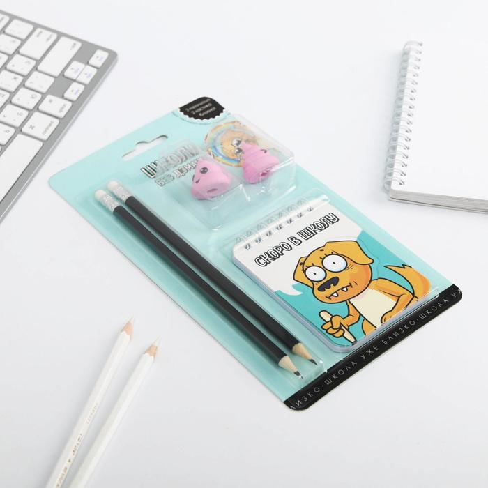 Подарочный набор канцелярский, ластики 2 шт., блокнот, карандаши «Скоро в школу» — Характеристики
