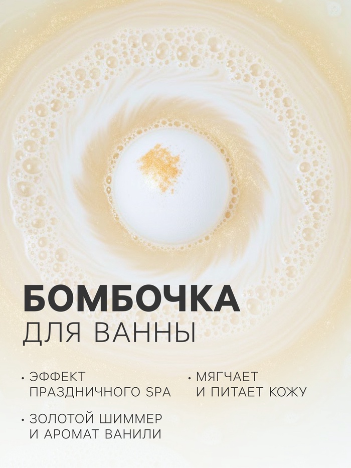 С золотым шиммером и ароматом ванили, помогает расслабиться и создать праздничную атмосферу. Опустите в ванну (36–38 °C), дождитесь полного растворения, принимайте 15–20 минут.