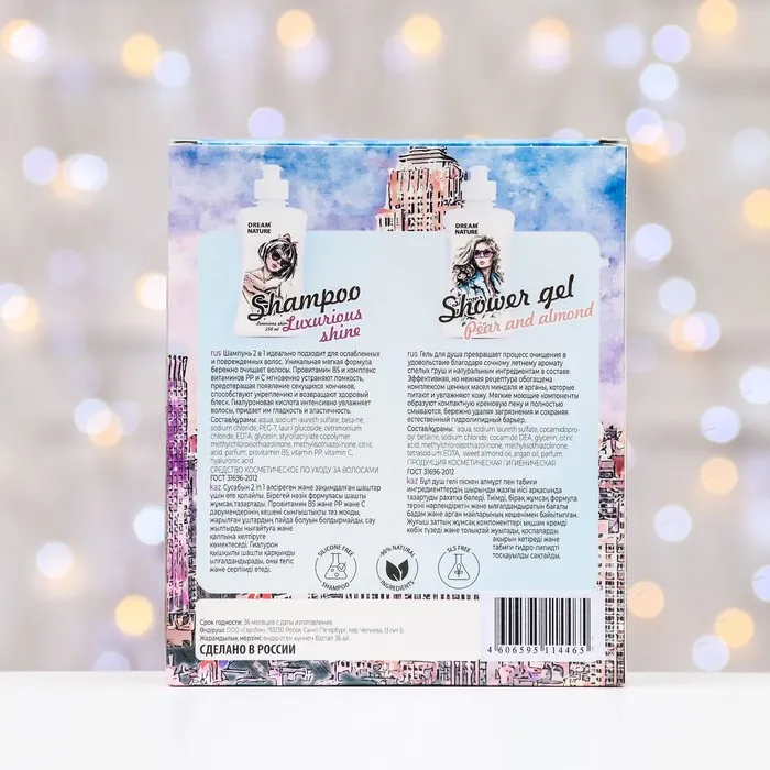 Состав: aqua, sodium laureth sulfate, betaine, sodium chloride, PEG-7, lauril glucoside, cetrimonium chloride, EDTA, glycerin, styrol\acrylate copolymer, methylchloroisothiazolinone, methylisothiazolinone, citric acid, parfum, provitamin B5, vitamin PP, vitamin С, hyaluronic acid.