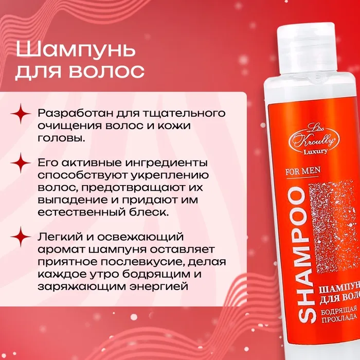 - Шампунь, 260 мл — разработан для тщательного очищения волос и кожи головы. Его активные ингредиенты способствуют укреплению волос, предотвращают их выпадение и придают им естественный блеск. Легкий и освежающий аромат шампуня оставляет приятное послевкусие, делая каждое утро бодрящим и заряжающим энергией.