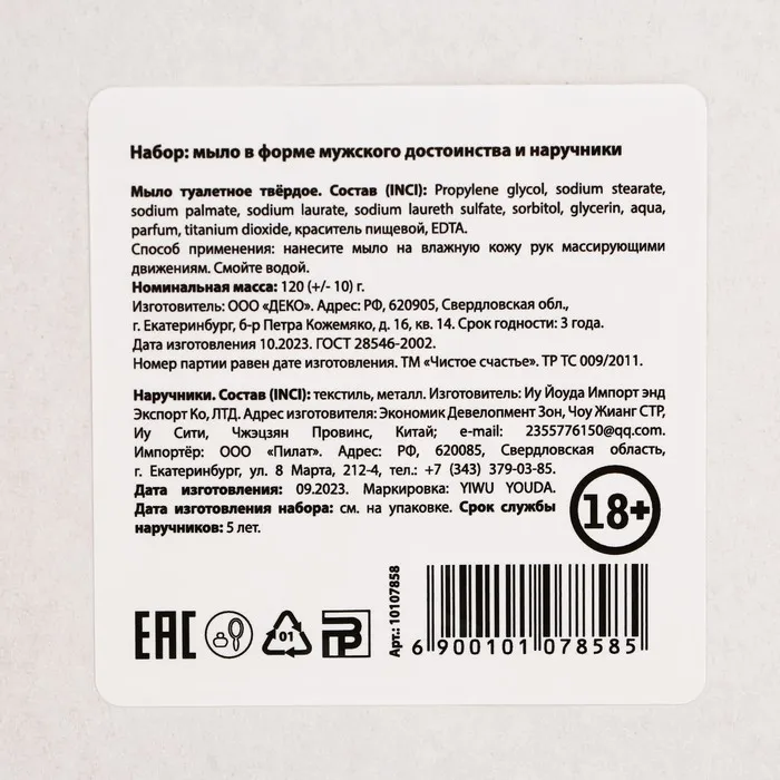 Подарочный набор косметики «Поиграем в ванной?», мыло для рук 120 г и наручники, 18+, ЧИСТОЕ СЧАСТЬЕ — Характеристики