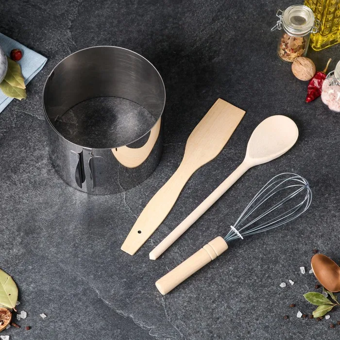 Подарочный набор кухонный, 4 предмета: раздвижная форма, лопатка деревянная, ложка деревянная, венчик — Характеристики