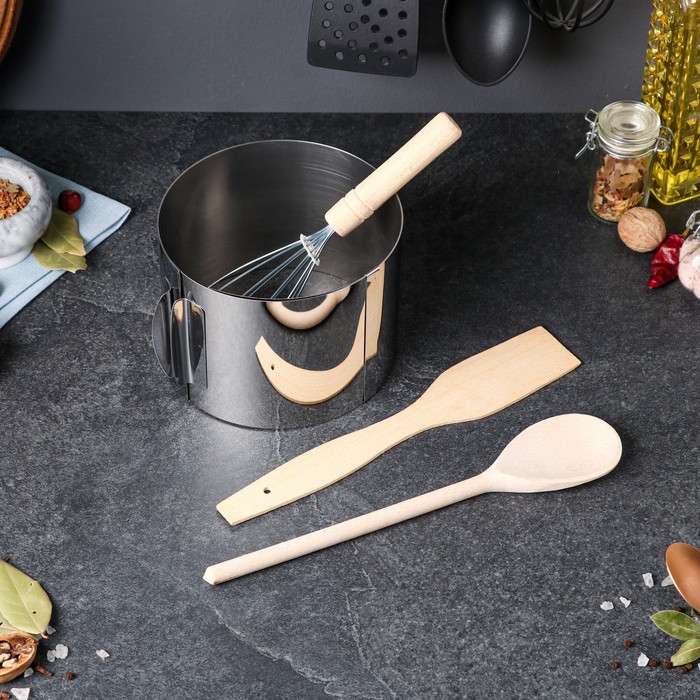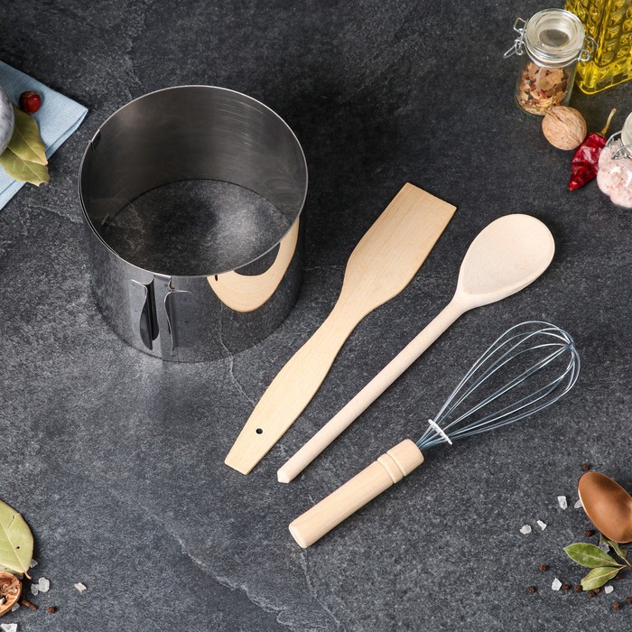Подарочный набор кухонный, 4 предмета: раздвижная форма, лопатка деревянная, ложка деревянная, венчик