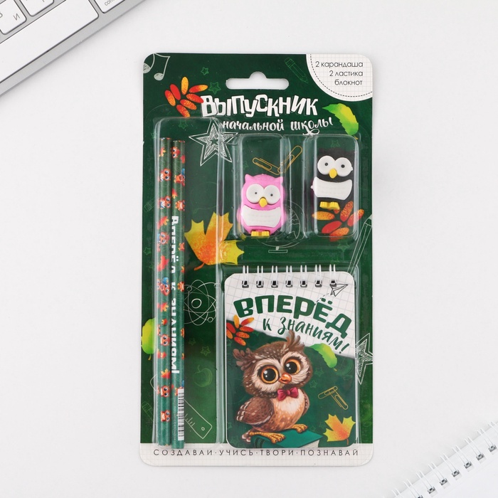 Подарочный набор, ластики 2 шт., карандаши HB 2 шт., блокнот А7 «Выпускной: Вперёд к знаниям!» — Характеристики