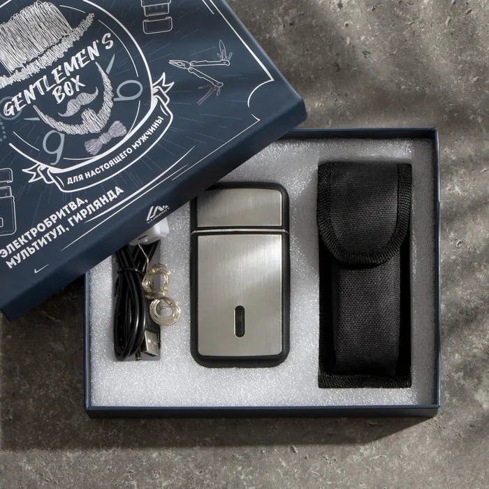Набор от Luazon станет приятным и практичным подарком на День Рождения, Новый Год, годовщину или любой другой праздник для мужчины. В BOX входят электробритва, мультитул в чехле и гирлянда.