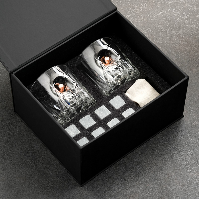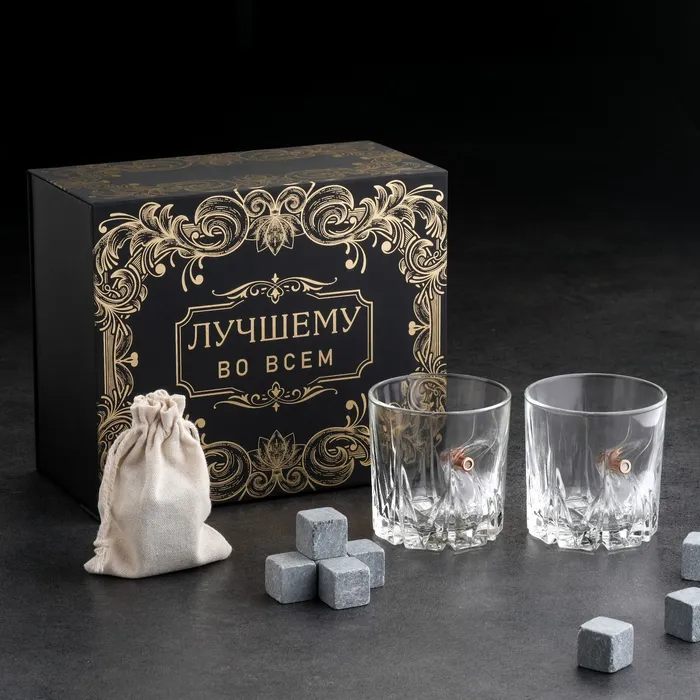 Подарочный набор «Лучшему», 2 непробиваемых стакана с пулей 200 мл, 8 камней для виски — Характеристики