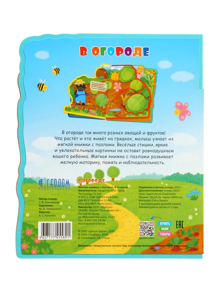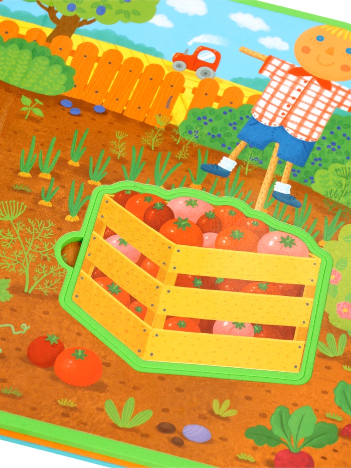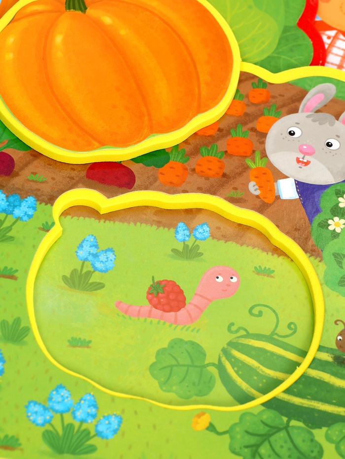 - Мягкая книжка ЭВА с пазлами «В огороде» — интерактивная книга из прочного материала, которая развивает мелкую моторику и логическое мышление.