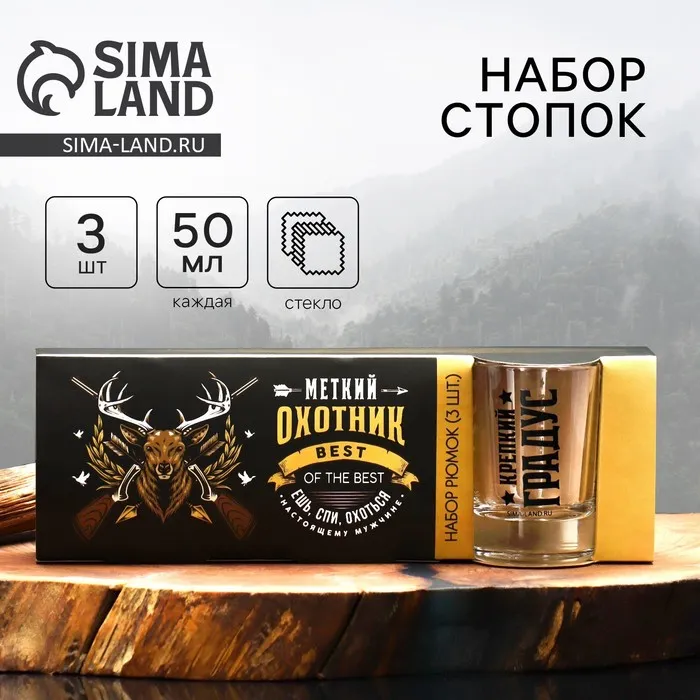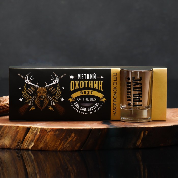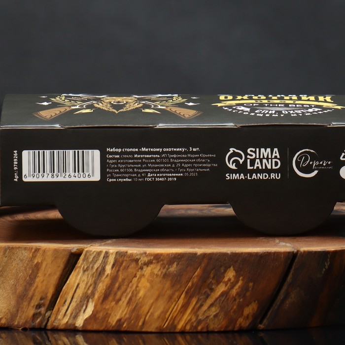 Подарочный набор «Меткому охотнику» состоит из трёх стопок объёмом 50 мл каждая. Стопки изготовлены из высококачественного и прочного стекла. Они идеально подходят для подачи крепких напитков, таких как водка или текила, а также для шотов.