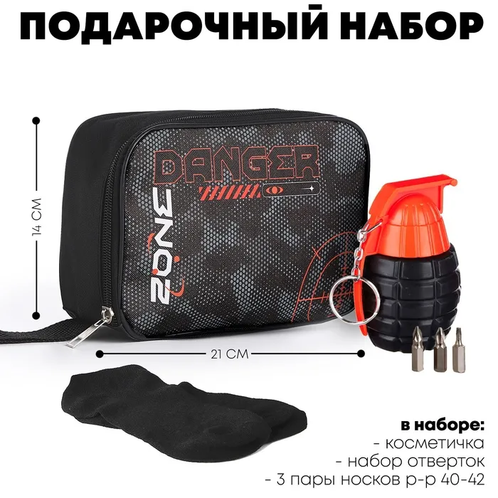 Подарочный набор мужской с косметичкой «Danger»: сумка, набор отверток, носки — Характеристики
