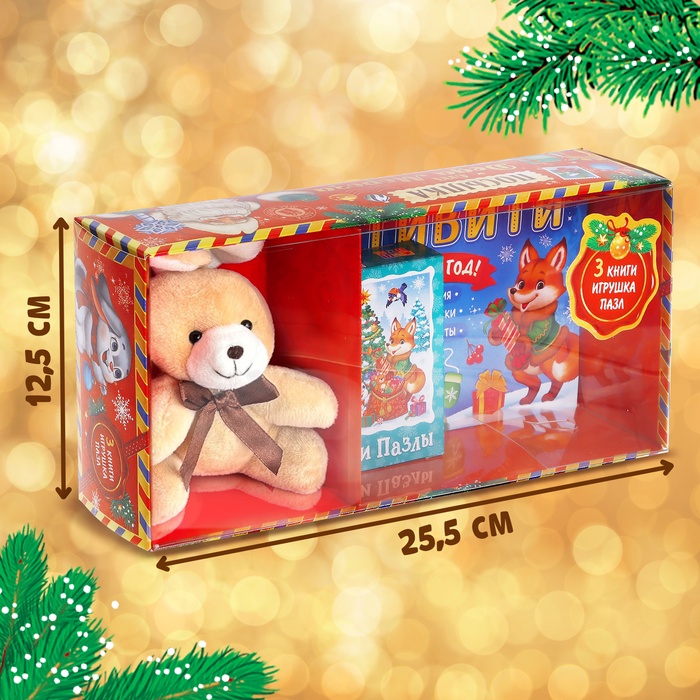 Подарочный набор с тремя книгами, игрушкой и пазлами станет эффектным презентом для малыша. Такой набор подойдёт для индивидуального поздравления дома и для подарков от Деда Мороза в детском саду.