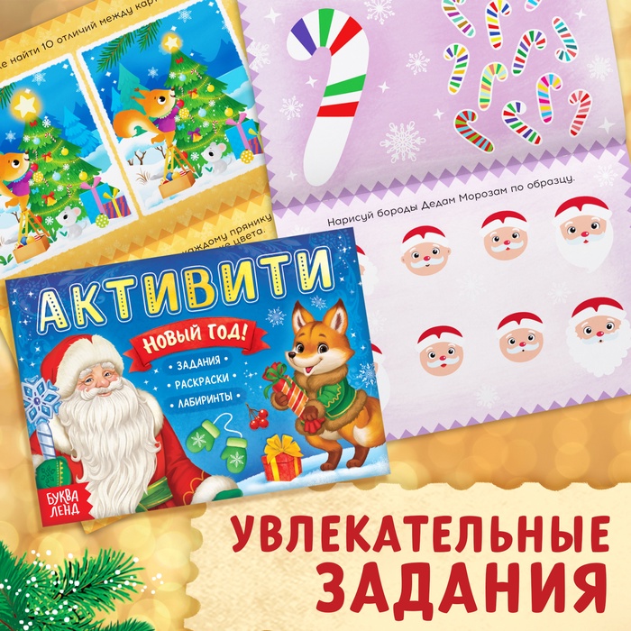 - В активити-книге, новогодних заданиях и раскраске малыш найдёт много интересных сюжетов и увлекательных задачек.