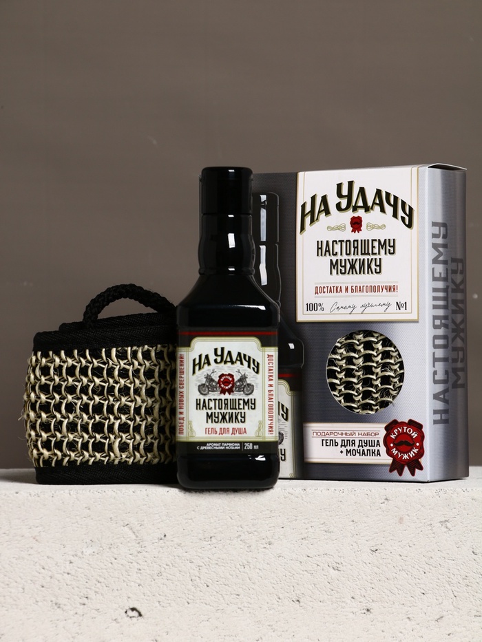 Подарочный набор «На удачу», гель для душа во флаконе виски, чёрный и мочалка лента, Чистое счастье — Характеристики