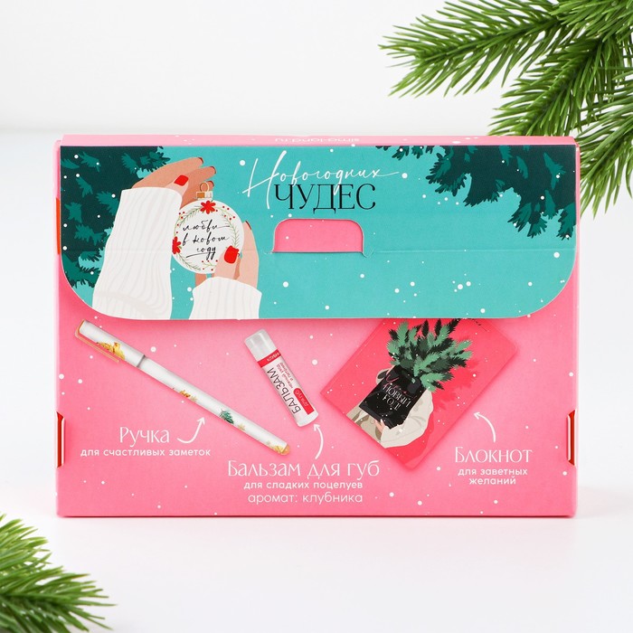 Подарочный набор новогодний, блокнот, ручка и бальзам для губ «Мечты сбудутся в новом году!» — Характеристики